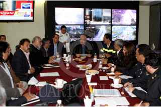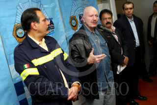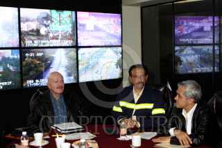 MÉXICO, D.F., 17SEPTIEMBRE2010.- Manuel Mondragón y Kalb, secretario de Seguridad Pública del D.F., Miguel Elías Moreno Brizuela, secretario de Protección Civil; Adrián Michel Espino, Oficial Mayor y Armando Ahued, secretario de Salud del D.F., durante una conferencia de prensa al termino que se realizo para dar seguimiento al fenómeno meteorológico Karl y las posibles lluvias en la ciudad que se realizo en el Centro de Monitoreo y Mando de la Secretaria de Seguridad Pública. FOTO: RODOLFO ANGULO/CUARTOSCURO.COM