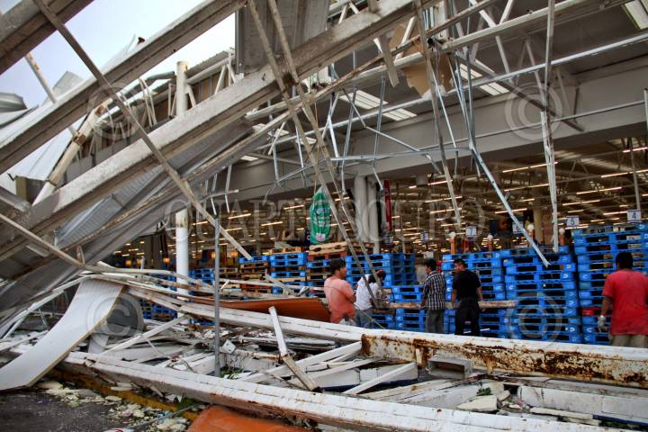VERACRUZ, VERACRUZ., 17SEPTIEMBRE2010.- Las fuertes rachas del Huracán Karl que azotaron la conurbación derribaron la estructura frontal de un centro comercial al norte del puerto de Veracruz, no se reportaron lesionados, solo algunos clientes que sufrieron crisis nerviosa al momento del desplome. FOTO: FÉLIX MÁRQUEZ/CUARTOSCURO.COM