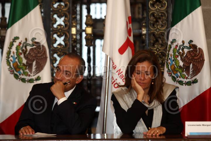 MÉXICO D.F., 19SEPTIEMBRE2010.- El presidente Felipe Calderón y su esposa Margarita Zavala durante la ceremonia conmemorativa del Día Nacional de Protección Civil que se realizo en el Salón de la Tesorería en Palacio Nacional. FOTO: RODOLFO ANGULO/CUARTOSCURO.COM