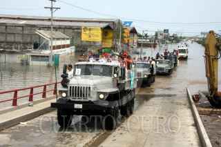 VERACRUZ, VERACRUZ. 20SEPTIEMBRE2010.- El presidente de México, Felipe Calderón Hinojosa, realizó, junto al mandatario estatal, Fidel Herrera Beltrán, un recorrido por el tramo inundado de la carretera Las Vegas-Jamapa, para constatar la afectación provocada por los efectos del huracán Karl en esta zona del estado de Veracruz. Previo a este escuchó a algunas de las personas afectadas. FOTO: JOSÉ CANDELARIO/CUARTOSCURO.COM
