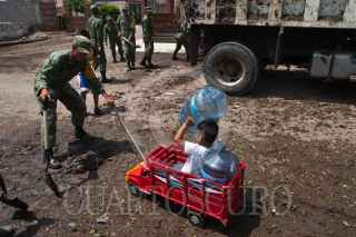 SAN JUAN DEL RIO, QUERÉTARO, 21SEPTIEMBRE2010.- Las inundaciones provocadas por las lluvias que causaron el desbordamiento del bordo Benito Juárez, en el oriente de la ciudad de San Juan del Rio causó perdidas millonarias en casas habitación. Actualmente la Secretaría de Salud y Cruz Roja implementaron un cerco de limpieza, vacunación y fumigación del mosquito del dengue. Así mismo el Ejército Mexicano aplicó el plan DNIII para desastres y vigilancia de las colonias para evitar la rapiña. La policía municipal destacó a los cadetes por sus labores de limpieza en las calles y avenidas que fueron afectadas. FOTO: DEMIAN CHÁVEZ/CUARTOSCURO.COM