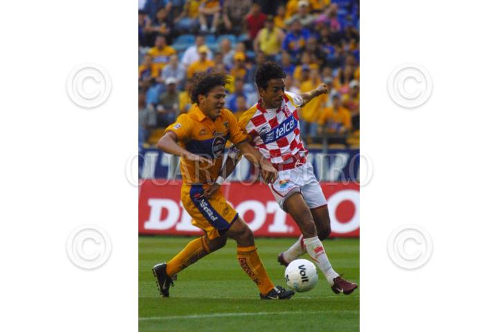 Monterrey, Nuevo León 03 ABRIL2004.- Antonio Sancho (tigres) Said Gonzalez (tecos)disputan un balón en el juego de la jornada 13 del torneo de clausura 2004 en donde los tigres vencieron 2 a uno a los tecos. FOTO: Jorge López/CUARTOSCURO.COM
