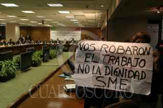 MÉXICO, D.F., 22SEPTIEMBRE2010.- Un grupo de mujeres del Sindicato Mexicano de Electricistas, se manifestó en contra y durante la comparecencia de José Francisco Blake Mora, Secretario de Gobernación, que se realiza en la Torre del Caballito. FOTO: MISAEL VALTIERRA/CUARTOSCURO.COM