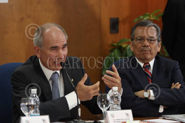 MÉXICO, D.F., 24SEPTIEMBRE2010.- Sergio Mayorga Castañeda, Secretario de Agricultura, compareció ante comisiones en el Senado de la República, atrás conversan los senadores Alberto Cárdenas (PAN) y Heladio Ramírez (PRD). FOTO: MOISÉS PABLO/CUARTOSCURO.COM