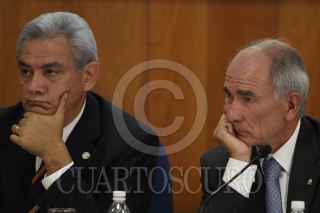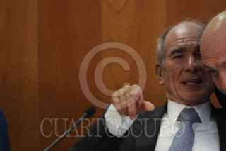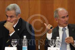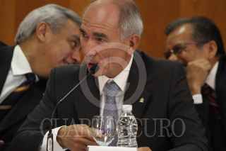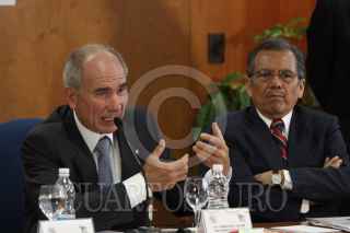 MÉXICO, D.F., 24SEPTIEMBRE2010.- Sergio Mayorga Castañeda, Secretario de Agricultura, compareció ante comisiones en el Senado de la República, atrás conversan los senadores Alberto Cárdenas (PAN) y Heladio Ramírez (PRD). FOTO: MOISÉS PABLO/CUARTOSCURO.COM