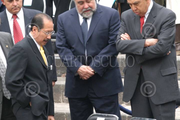 México, D.F. 05 ABRIL 2004.- Vicente Fox, primer mandatario y María Teresa Juárez viuda de Castillo, se retiran del monumento de Heberrto Castillo, al término de la ceremonia de inhumación en el panteón Dolores. FOTO: Sandra Perdomo/CUARTOSCURO.COM