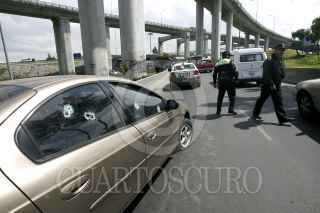 MÉXICO, D.F., 25SEPTIEMBRE2010.- Una pareja resulto grave con lesiones por arma de fuego, cuando viajaban a bordo del auto Neon color oro con placas de circulación 975-LWR, después de que dos sujetos a bordo de una Motocicleta de la que se desconocen características, se les emparejo disparando en contra de estos. Por tal motivo la mujer fue internada en un Hospital privado de la zona y el masculino trasladado al Hospital Balbuena. Los hechos se registraron en la parte baja del puente conocido como la concordia, que une la autopista México Puebla con la Calzada Zaragoza en los límites del Distrito Federal y el Municipio de Los Reyes La Paz. Hasta este lugar, arribaron elementos de la Procuraduría del Distrito Federal, para tomar conocimiento de los Hechos. Asegurando en el lugar, a un sujeto de aproximadamente 40 años que viajaba en una camioneta marca Honda tipo Pick Up de color negra con placas 581- UWG ya que dicho sujeto, intento llevarse a uno de los heridos. Elementos policíacos informaron que al interior del Neon se encontraron dos maletas con sustancias con apariencia sospechosa, al parecer, algún tipo de droga. FOTO: LUIS CARBAYO/CUARTOSCURO.COM