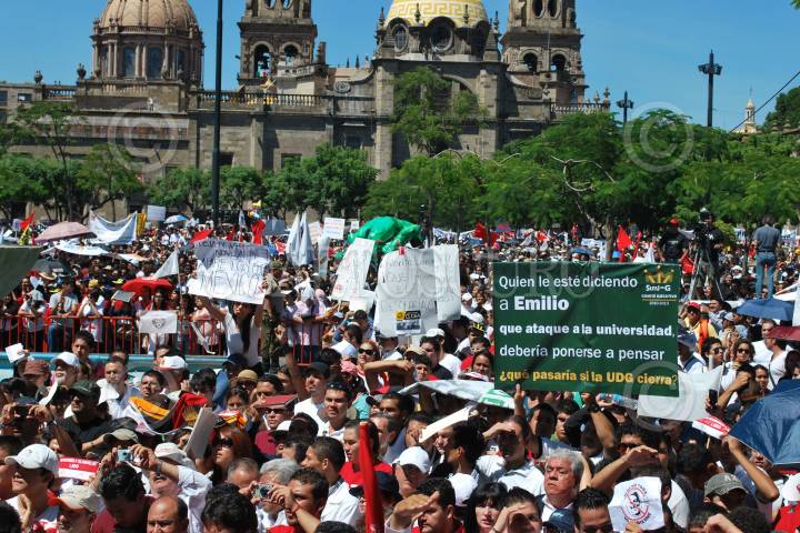 GUADALAJARA, JALISCO, 29SEPTIEMBRE2010.- La mega marcha convocada por la Universidad de Guadalajara (U de G) reunió a miles en la plaza Liberación y llenó varias calles del primer cuadro de la ciudad. Alrededor de 86,000 personas marcharon desde 5 puntos y convergen en la plaza más grande de la ciudad. Los estudiantes demandaron más recursos para su Universidad. FOTO: SERGIO GARIBAY/CUARTOSCURO.COM