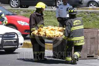 MÉXICO, D.F., 29SEPTIEMBRE2010.- Varias toneladas de pollo congelado, quedaron regadas en la cinta asfáltica al volcar uno de los contenedores de un trailer de la Empresa Bachoco, en la curva de incorporación de avenida Alencastre a Periférico en la colonia Bosque de Chapultepec, perímetro de la Delegación Miguel Hidalgo. FOTO: LUIS CARBAYO/CUARTOSCURO.COM