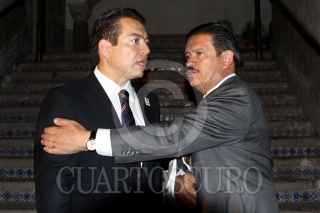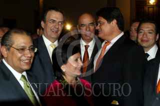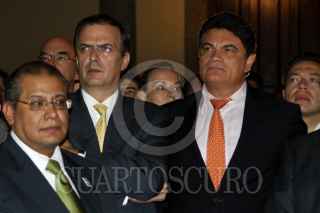 MÉXICO D.F., 30SEPTIEMBRE2010.- Marcelo Ebrard, jefe de gobierno del Distrito Federal, Dante Delgado; Mario Lopez Valdez, gobernador electo de Sinaloa y Amalia Garcia, ex gobernadora de Zacatecas al termino de la presentación de la Fundación Equidad y Progreso que se realizo en el Museo Casa de la Bola. FOTO: RODOLFO ANGULO/CUARTOSCURO.COM