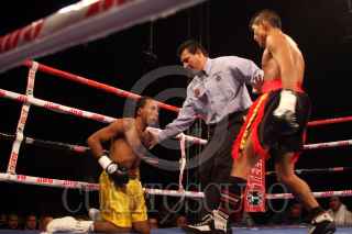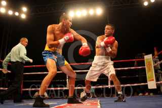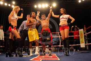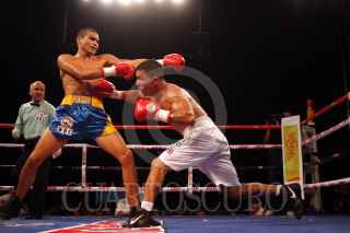 MERIDA, YUCATAN, 03OCTUBRE2010.- Juan “Loquito” Kantún superó ampliamente al costarricense Eddy Zúñiga y lo derrotó por nócaut técnico en el quinto asalto. El yucateco, quien subió enmascarado al cuadrilátero, golpeaba a placer a Zúñiga cuando el réferi detuvo la pelea que se realizo la noche de ayer ante poco más de 2 mil aficionados en el Polifórum Zamná de esta ciudad. FOTO: FRANCISCO BALDERAS/CUARTOSCURO.COM