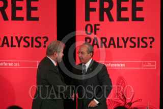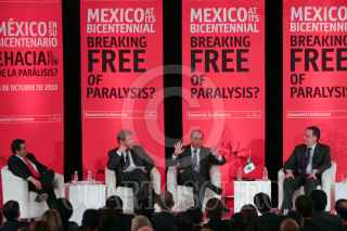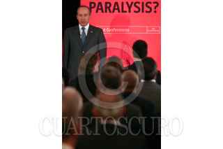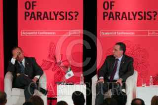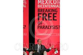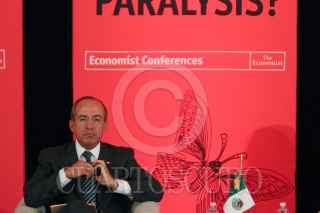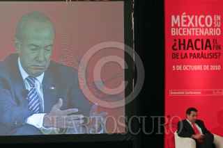 MÉXICO, D.F., 05OCTUBRE2010.- Michael Reid, Editor para las Américas de The Economist (moderador) y Felipe Calderón Hinojosa, presidente de México, participaron en el ciclo de conferencias: Mexico Summit 2010, México en su bicentenario: ¿Saliendo de la parálisis?, que organiza el The Economist. La conferencia titulada "La Perspectiva del Gobierno: Cumpliendo las promesas de largo plazo" el cual encabezó el presidente, se realizó en el hotel Four Seasons, ubicado en Paseo de la Reforma. FOTO: MISAEL VALTIERRA/CUARTOSCURO.COM