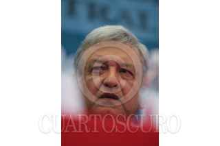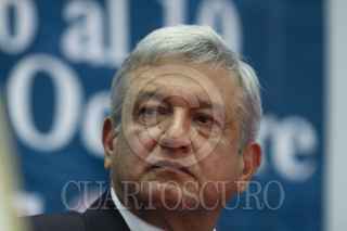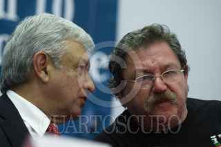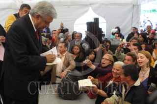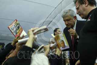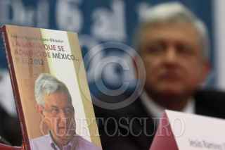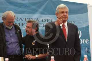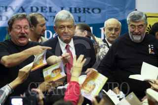 MÉXICO, D.F., 06OCTUBRE2010.- Andres Manuel López Obrador, ex candidato presidencial y autodenominado presidente legitimo de México acompañado de Paco Ignacio Taibo II al termino de la presentación de su libro: "La Mafia que se Adueño de México.. y el 2012" que se realizo en la Feria Alternativa del Libro que se realiza en la Alameda Central. FOTO: RODOLFO ANGULO/CUARTOSCURO.COM