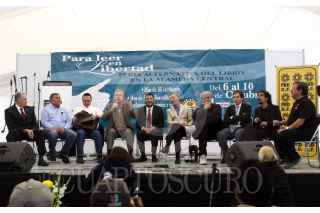 MÉXICO, D.F., 06OCTUBRE2010.- Javier Gonzalez Garza, Martí Batres, Héctor Díaz Polanco, Armando Bartra, Rodrigo Oropeza, Paco Ignacio Taibo II durante una platica denominada "Tertulia: El Estado de la Nación" en el marco de la Feria Alternativa del Libro que se realiza en la Alameda Central. FOTO: RODOLFO ANGULO/CUARTOSCURO.COM