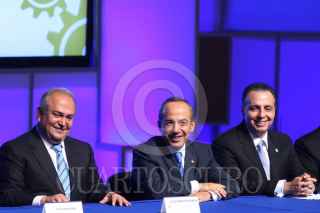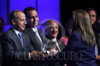 TIJUANA, BAJA CALIFORNIA, 07OCTUBRE2010.- El presidente Felipe Calderón acompañado de José Guadalupe Osuna Millan, gobernador de Baja California y de Bruno Ferrari, secretario de Economía durante el primer encuentro Tijuana Innovadora 2010 en donde se realizo la entrega del Premio Nacional de Calidad. FOTO: ADOLFO JASSO/CUARTOSCURO.COM