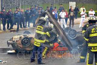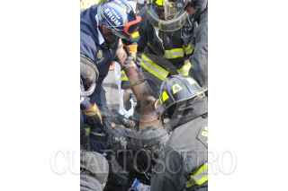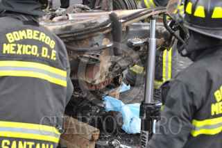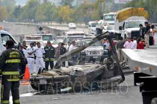 MÉXICO, D.F., 10OCTUBRE2010.- Dos sujetos que respondían a los nombres de Nicolás Zapata de 63 años y Filiberto Amescua del que se desconoce la edad, perdieron la vida calcinados al volcar el auto Porsche Carrera 1961 con placas 584-TBG en el Kilómetro 16 de la Autopista México - Toluca en perímetro del Complejo Santa Fe, al perder el control derribando la barra de contención, también se vio involucrado un auto Derby con placas 566-PYH. Al lugar arribaron elementos de bomberos y unidades de emergencia sin que pudieran salvar sus vidas. Los cadáveres fueron trasladados por elementos periciales a sus instalaciones en perímetro de la Delegación Álvaro Obregón. FOTO: LUIS CARBAYO/CUARTOSCURO.COM