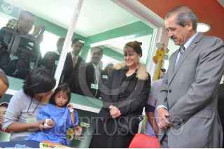 CUAUTITLAN IZCALI, ESTADO DE MÉXICO, 11OCTUBRE2010.- José Ángel Cordova Villalobos, secretario de Salud en compañía del secretario estatal Gabriel O´shea y Gabriela Gallardo de Cordova presidenta del voluntariado de salud, donde inauguraron la aula "Sigamos Aprendiendo en el Hospital" dentro del Hospital General de Cuautitlan, con los apoyos de la fundación "Ronald Macdonald". En esta aula se ayuda a los pequeños que padecen enfermedades de larga estancia. FOTO: EDUARDO MORALES/CUARTOSCURO.COM
