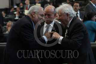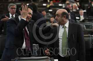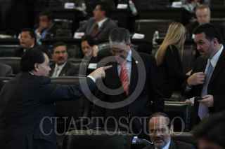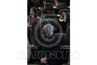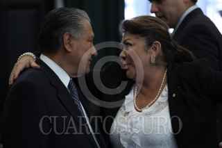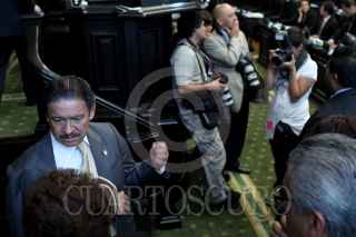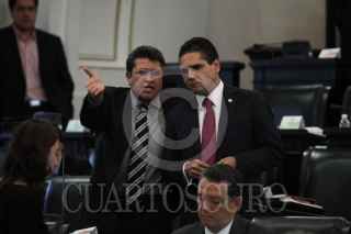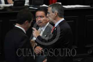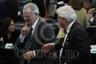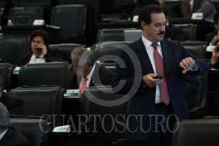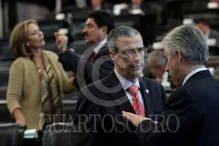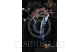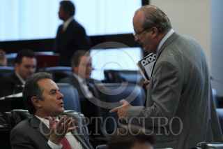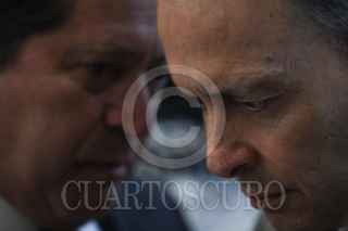 MÉXICO, D.F., 12OCTUBRE2010.- El coordinador panista José González Morfín, atentó a la platica de su correligionario Ricardo García Cervantes, en la sesión de la Cámara de Senadores. FOTO: MOISÉS PABLO/CUARTOSCURO.COM