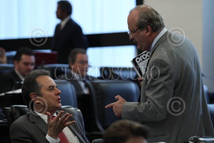 MÉXICO, D.F., 12OCTUBRE2010.- El coordinador panista José González Morfín, atentó a la platica de su correligionario Ricardo García Cervantes, en la sesión de la Cámara de Senadores. FOTO: MOISÉS PABLO/CUARTOSCURO.COM