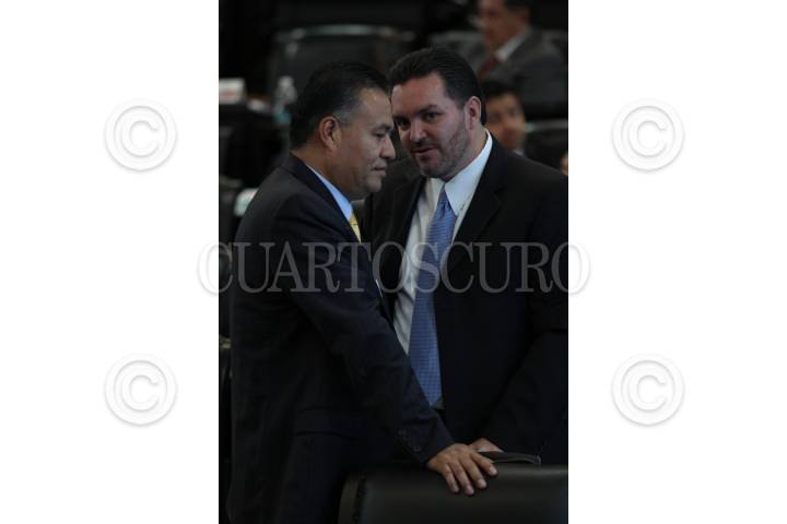 MÉXICO, D.F., 12OCTUBRE2010.- El coordinador panista José González Morfín, atentó a la platica de su correligionario Ricardo García Cervantes, en la sesión de la Cámara de Senadores. FOTO: MOISÉS PABLO/CUARTOSCURO.COM