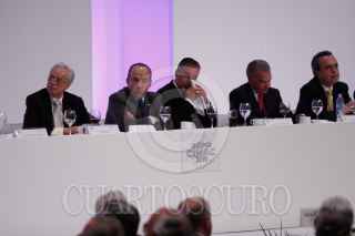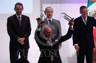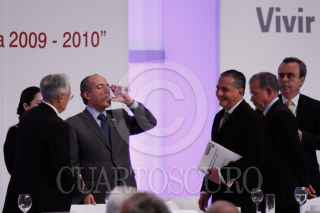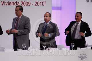 MÉXICO, D.F., 13OCTUBRE2010.- Pablo Álvarez Treviño, presidente del Comité Ejecutivo del Centro Impulsor de la Construcción y la Habitación A. C. (CIHAC); Felipe Calderón Hinojosa, presidente de México; Heriberto Félix Guerra, titular de la Sedesol; y Andrés Granier Melo, gobernador de Tabasco; durante la comida del III Foro Internacional "Innovación y desarrollo urbano en la próxima década" de la Expo Chihac 2010 realizado en el Centro Banamex. FOTO: IVÁN STEPHENS/CUARTOSCURO.COM