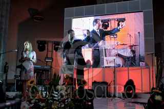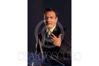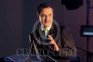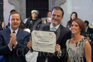 MÉXICO, D.F., 13OCTUBRE2010.- Karen Sanchez, presidenta del consejo directivo del CIRT hizo entrega de un reconocimiento a Marcelo Ebrard, jefe de gobierno del Distrito Federal durante la comida de la 52 Semana Nacional de Radio y Televición que se realiza en el Museo Interactivo de Economía. FOTO: RODOLFO ANGULO/CUARTOSCURO.COM