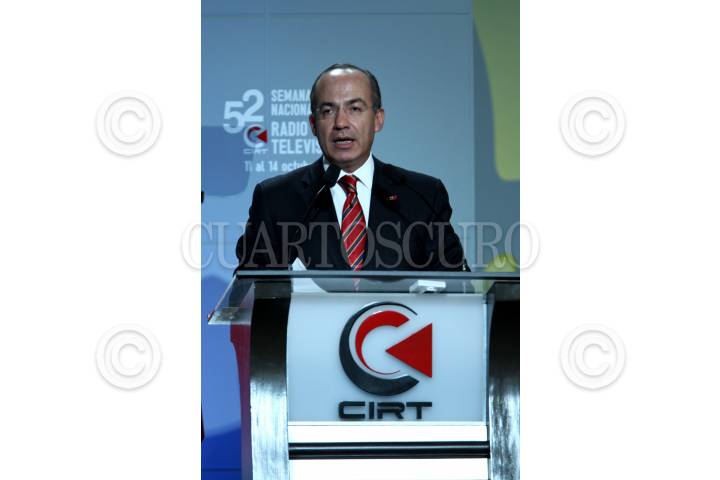 MÉXICO, D.F., 14OCTUBRE2010.- El presidente Felipe Calderón acompañado de Karen Sanchez, presidenta del consejo directivo del CIRT otrorgaron un premio al actor Emilio Echevaria durante la clausura de la 52 Semana Nacional de Radio y Televisión que se realizo en el World Trade Center. FOTO: RODOLFO ANGULO/CUARTOSCURO.COM