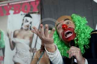 MÉXICO, D.F., 15OCTUBRE2010.- Brozo el payaso tenebroso y su asistente La Reata, presentaron el número de la revista Playboy en el cual salen ilustrando la portada bajo el título "La Reata Bicentenaria de Brozo en boca de todos". La publicación muestra imágenes de la bella asistente representando arquetipos de la historia de México, como Sor Juana Ines de la Curz y la Diana Cazadora. FOTO: MOISÉS PABLO/CUARTOSCURO.COM