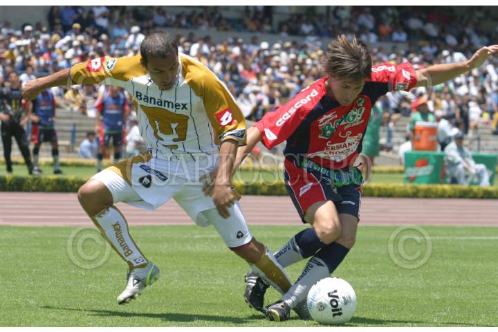 MÉXICO, D.F. 18 ABRIL 2004.- Cero a cero fue el resultado final en juego de la jornada 15 del torneo de clausura 2004 entre los Pumas de la UNAM y los Freseros de Irapuato. En la gráfica Moctezuma Serrato (Pumas) hace una chilena y Roland Gómez (Irapuato) intenta tener el control del esférico. FOTO: Iván Stephens/CUARTOSCURO.COM