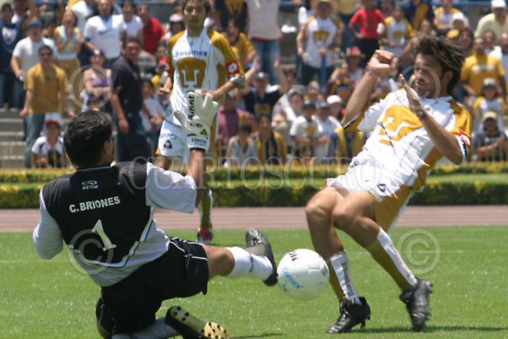 MÉXICO, D.F. 18 ABRIL 2004.- Cero a cero fue el resultado final en juego de la jornada 15 del torneo de clausura 2004 entre los Pumas de la UNAM y los Freseros de Irapuato. En la gráfica Moctezuma Serrato (Pumas) hace una chilena y Roland Gómez (Irapuato) intenta tener el control del esférico. FOTO: Iván Stephens/CUARTOSCURO.COM