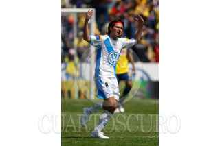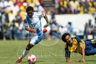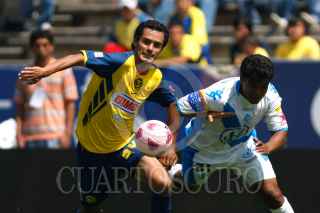 PUEBLA, PUELBA, 17OCTUBRE2010.- El Puebla de la Franja logró obtener el empate ante la visita de las Águilas del América en el estadio Cuauhtémoc dejando el marcador 2 a 2 en la jornada 12 del torneo apertura del fútbol mexicano. El jugador mexicano Daniel Omar Márquez, de las águilas del América, disputa un balón con el jugador mexicano Melvin Brown. FOTO: FRANCISCO GUASCO/CUARTOSCURO.COM
