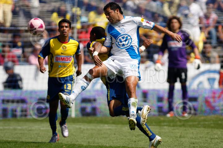 PUEBLA, PUELBA, 17OCTUBRE2010.- El Puebla de la Franja logró obtener el empate ante la visita de las Águilas del América en el estadio Cuauhtémoc dejando el marcador 2 a 2 en la jornada 12 del torneo apertura del fútbol mexicano. El jugador mexicano Daniel Omar Márquez, de las águilas del América, disputa un balón con el jugador mexicano Melvin Brown. FOTO: FRANCISCO GUASCO/CUARTOSCURO.COM