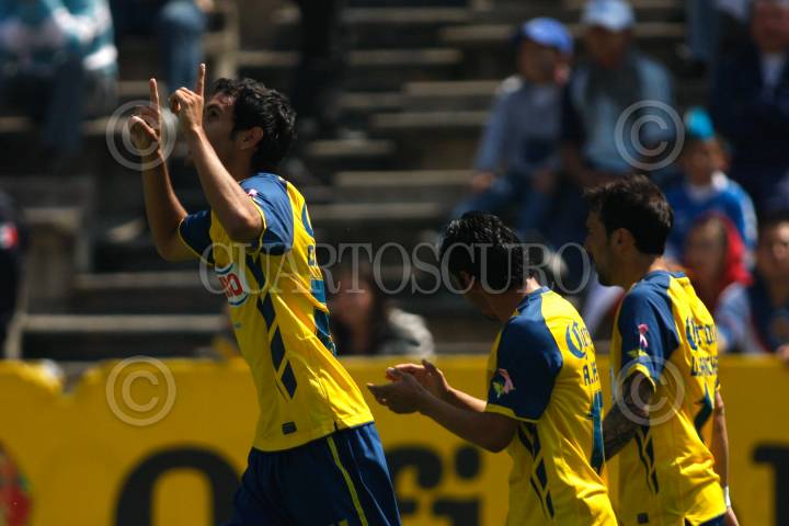 PUEBLA, PUELBA, 17OCTUBRE2010.- El Puebla de la Franja logró obtener el empate ante la visita de las Águilas del América en el estadio Cuauhtémoc dejando el marcador 2 a 2 en la jornada 12 del torneo apertura del fútbol mexicano. El jugador mexicano Daniel Omar Márquez, de las águilas del América, disputa un balón con el jugador mexicano Melvin Brown. FOTO: FRANCISCO GUASCO/CUARTOSCURO.COM