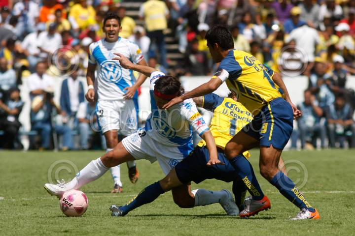 PUEBLA, PUELBA, 17OCTUBRE2010.- El Puebla de la Franja logró obtener el empate ante la visita de las Águilas del América en el estadio Cuauhtémoc dejando el marcador 2 a 2 en la jornada 12 del torneo apertura del fútbol mexicano. El jugador mexicano Daniel Omar Márquez, de las águilas del América, disputa un balón con el jugador mexicano Melvin Brown. FOTO: FRANCISCO GUASCO/CUARTOSCURO.COM