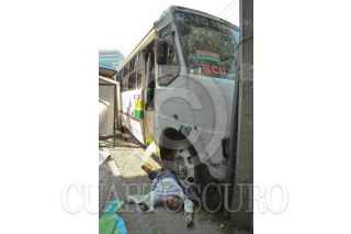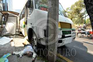 MÉXICO, D.F., 17OCTUBRE2010.- Una mujer de la tercera edad, perdió la vida al ser atropellada por un autobús de la ruta 111 con placas de circulación 111-057. Al parecer después de quedar sin frenos, el camión se impactó contra el parabús donde la desafortunada mujer esperaba su transporte, impactando dicho paradero y estrellándose contra un poste, quedando la mujer bajo el pesado camión. Dicho accidente registrado sobre la carretera Picacho Ajusco a la altura de la colonia Jardines de la Montaña perímetro de la Delegación Tlalpan. FOTO: LUIS CARBAYO/CUARTOSCURO.COM