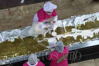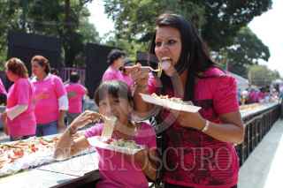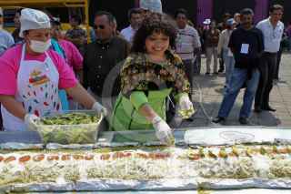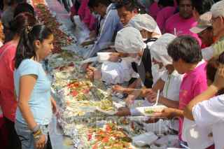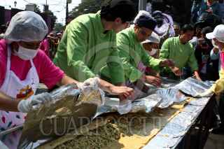 MÉXICO, D.F., 17OCTUBRE2010.- Cientos de voluntarios realizaron la Enchilada mas Grande del Mundo la cual rompió el Record Guinness con 70 metros de longitud, 30 centímetros de diámetro y una tonelada 416 kilogramos de peso; para su elaboración se utilizaron 180 litros de salsa verde y 600 kilos de relleno de pollo con calabacitas y chilacas; dicho evento se realizo en el marco de la Feria de la Enchilada que se realiza hasta el día de hoy en la explanada delegacional de Iztapalapa. FOTO: RODOLFO ANGULO/CUARTOSCURO.COM