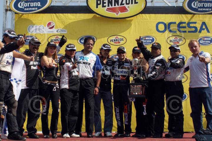 AMOZOC, PUEBLA, 17OCTUBRE2010.-El piloto mexicano, Germán Quiroga, de la escudería Telcel Racing, obtuvo la primera posición en la serie Nascar 2010, que se llevó a cabo en el autódromo Miguel E. Abed del municipio de Amozoc. FOTO: FRANCISCO GUASCO/CUARTOSCURO.COM