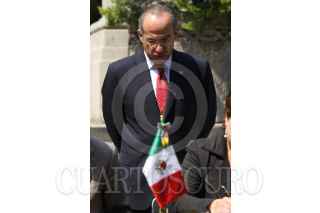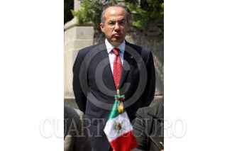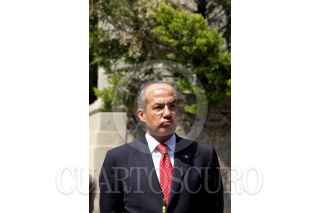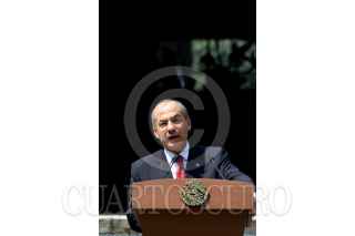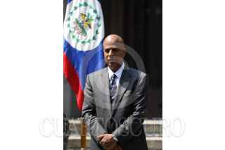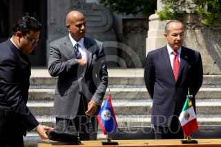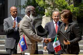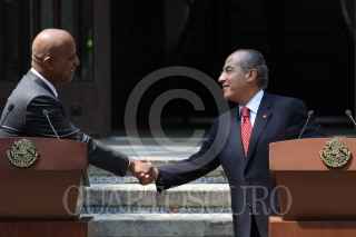 MÉXICO, D.F., 19OCTUBRE2010.- Dean O. Barrow, primer ministro de Belice, saluda a su homólogo mexicano Felipe Calderón Hinojosa, al finalizar un mensaje por parte de los mandatarios tras firma una serie de acuerdos en pos de mejorar las relaciones entre las naciones, esto se realizó en la escalinatas de la residencia oficial de Los Pinos. FOTO: MOISÉS PABLO/CUARTOSCURO.COM