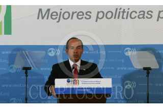 MEXICO, D.F., 19OCTUBRE2010.- Felipe Calderón Hinojosa, presidente de México, durante su mensaje a los asistentes al 50 Aniversario de la Organización para la Cooperación y el Desarrollo Económico (OCDE), que se realizó en el salón Alcazar del Castillo de Chapultepec esta noche. FOTO: JACK GILLIAN/CUARTOSCURO.COM