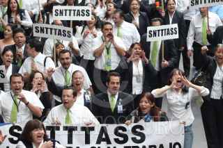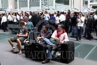 MÉXICO, D.F., 20OCTUBRE2010.- Cientos de sobrecargos, pilotos, y trabajadores de tierra de Mexicana de Aviación marcharon dentro de la Terminal 2 del Aeropuerto capitalino en donde realizaron una protesta ante la crisis económica de la aerolínea en donde demandaron una solución para que se reanuden las actividades lo antes posible. FOTO: RODOLFO ANGULO/CUARTOSCURO.COM