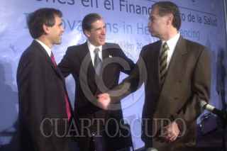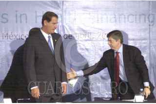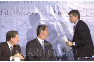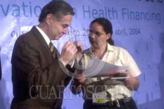 México D.F 20 Abril 2004.- El presidente Vicente Fox Quesada saluda a Cesar Gaviria Trujillo, secretario general de la organización de estados americanos, durante la apertura de la conferencia internacional "Innovaciones en el Financiamiento de la Salud". FOTO: Eunice Adorno/CUARTOSCURO.COM