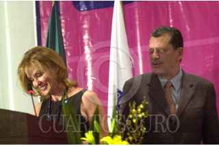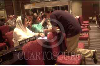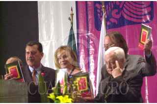 México D.F 20 Abril 2004.- El senador Enrique Jackson, la actriz Jessica Lange, embajadora de la buena voluntad de la UNICEF, Sergio Páez Verdugo ( Presidente de la Unión Interparlamentaria), Anders B. Johnsson (Secretario General de la UIP) muestran un manual para los parlamentarios a cerca de los derechos de los niños. FOTO: Eunice Adorno/CUARTOSCURO.COM