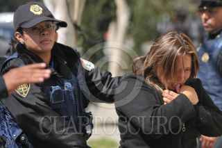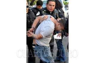 MÉXICO, D.F., 25OCTUBRE2010.- Una persona acompañado de una mujer que dijo ser su esposa, fueron detenidos por la presunta portación de una arma tipo AK-47 de las llamadas "cuerno de chivo" en el Sector Plateros, por lo que fueron puestos a disposición ante el Ministerio Publico en la 50 Agencia en la colonia Doctores. FOTO: LUIS CARBAYO/CUARTOSCURO.COM