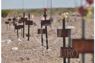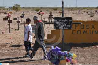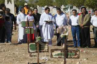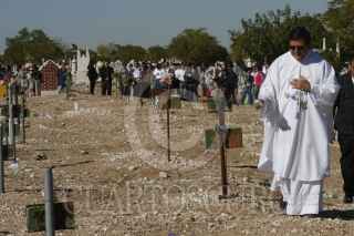 CIUDAD JUAREZ, CHIHUAHUA, 02NOVIEMBRE2010.- El vicario José René Blanco, tras oficiar la Santa Misa en el panteón San Rafael, acudió hasta la zona de la fosa común para dar la bendición a 2 mil 775 difuntos que allí se encuentran. El religioso mencionó que independientemente de la actitud o tipo de vida que hayan llevado, se trata de un ser humano y tiene derecho a descansar en paz, por lo que acudió hasta las tumbas para regar sobre ellas agua bendita y que con ello consigan su eterno descanso. FOTO: NACHO RUIZ/CUARTOSCURO.COM
