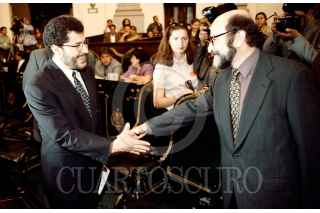 El presidente de la CDHDF Luis de la Barreda Solórzano pidió una vez más a la Procuraduría General de Justicia del D.F. la libertad de Paola Durante, presunta responsable del asesinato de Paco Stanley. Aqui Marti Batres acude a saludar a De la Barreda en su llegada.