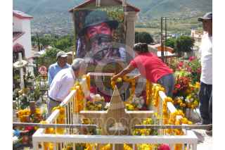 CHILPALCINGO, GUERRERO, 04NOVIEMBRE2010.- Aspecto general de la visita que hicieron integrantes de diversas organizaciones sociales, a la tumba donde descansan los restos mortales del comandante "Ramiro" máximo lider del Ejército Revolucionario del Pueblo Insurgente (ERPI), al cumplirse un año de su cobarde asesinato este jueves, colocando cruces así como arreglos florales en su sepulcro. La imagen en el panteón nuevo de la capital del estado. FOTO: OSCAR ALVARADO/CUARTOSCURO.COM