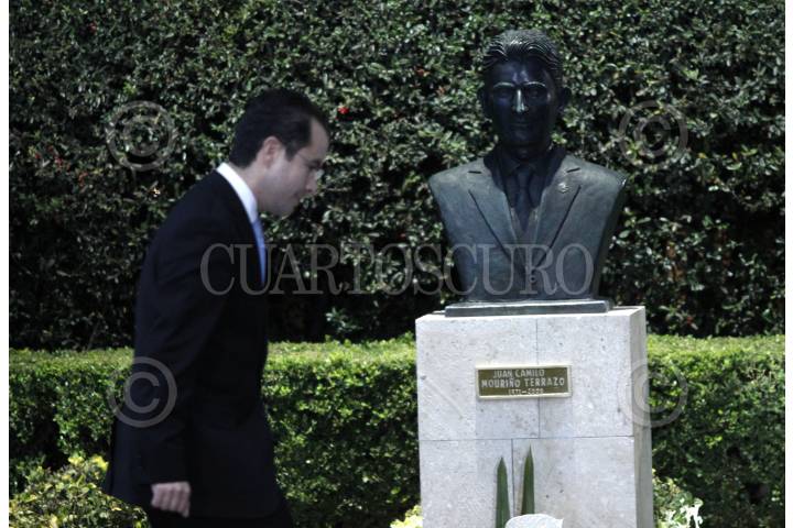 MÉXICO, D.F., 04NOVIEMBRE2010.- Mariana Gómez del Campo, líder de la bancada del PAN en la Asamblea Legislativa del Distrito Federal, se tomó una fotografía en el busto que se develó en la sede nacional del PAN en memoria de Juan Camilo Mouriño a dos años del accidente aéreo en el que falleció. FOTO: IVAN STEPHENS/CUARTOSCURO.COM