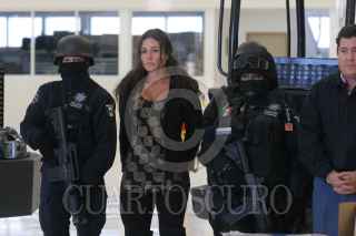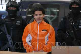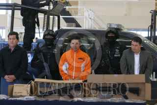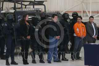 MÉXICO, D.F., 05NOVIEMBRE2010.- Elementos de la Policía Federal, presentaron ante los medios de comunicación a Harold Mauricio Poveda Ortega alias "El Conejo" junto con dos hombres y una mujer de nacionalidad colombiana, "El Conejo" es considerado el mayor proveedor de cocaína a la organización delictiva de los Beltran Leyva. FOTO: SAÚL LÓPEZ/CUARTOSCURO.COM