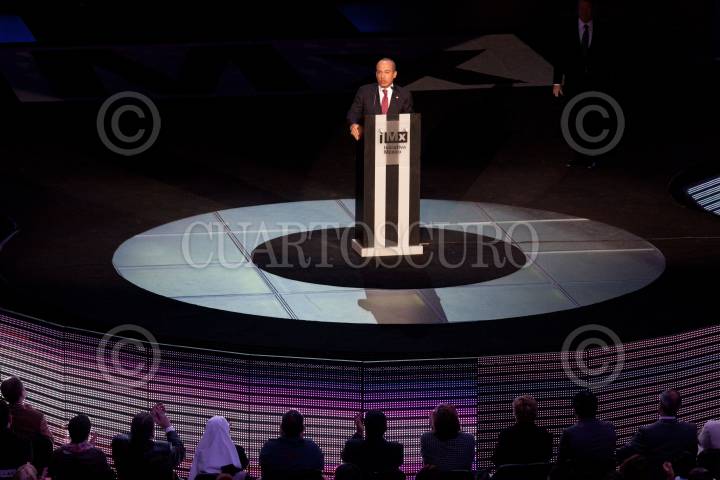 MÉXICO, D.F., 07NOVIEMBRE2010.- Sergio Sarmiento y Carlos Loret de Mola, periodistas, fueron los conductores de la final de Iniciativa México, la cual se realizó en el Auditorio Nacional con la asitencia de comunicadores, empresarios y políticos del país. En la imagen de izquierda a derecha; Emilio Azcárraga Jean, presidente de Grupo Televisa; Alejandro y Vicente Fernández, cantantes de música ranchera; Ricardo Salinas Pliego, presidente de Grupo Salinas; Juan Francisco Ealy Ortiz, presidente del Consejo de Administración del periódico El Universal; Rogerio Azcárraga Madero, director de Radio Formula y Francisco González, presidente de Multimedios. FOTO: MISAEL VALTIERRA/CUARTOSCURO.COM