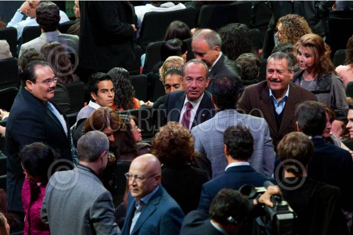 MÉXICO, D.F., 07NOVIEMBRE2010.- Sergio Sarmiento y Carlos Loret de Mola, periodistas, fueron los conductores de la final de Iniciativa México, la cual se realizó en el Auditorio Nacional con la asitencia de comunicadores, empresarios y políticos del país. En la imagen de izquierda a derecha; Emilio Azcárraga Jean, presidente de Grupo Televisa; Alejandro y Vicente Fernández, cantantes de música ranchera; Ricardo Salinas Pliego, presidente de Grupo Salinas; Juan Francisco Ealy Ortiz, presidente del Consejo de Administración del periódico El Universal; Rogerio Azcárraga Madero, director de Radio Formula y Francisco González, presidente de Multimedios. FOTO: MISAEL VALTIERRA/CUARTOSCURO.COM